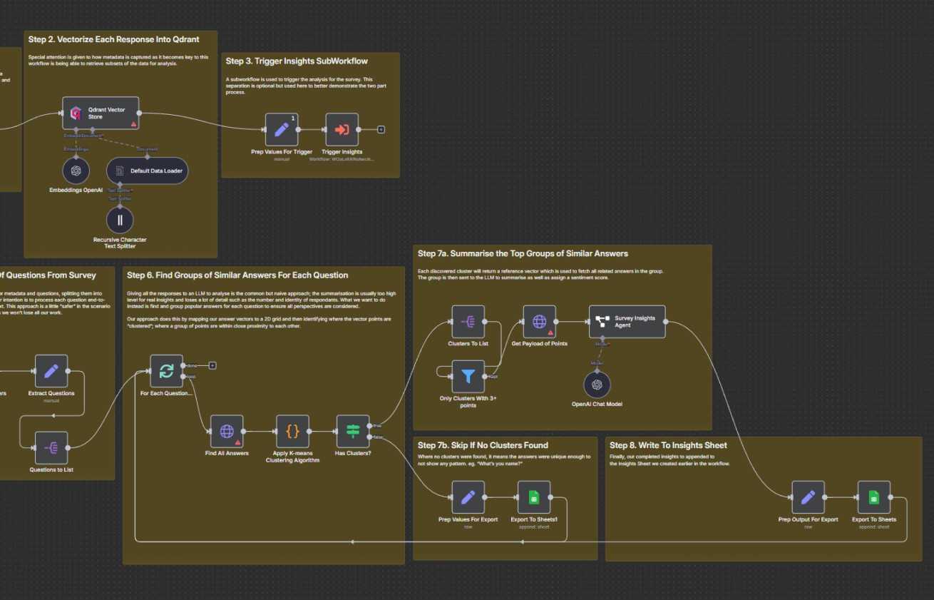 The solution is a multi-stage analysis pipeline that ingests survey data into Google Sheets, embeds responses as vectors, and uses K-means clustering to group similar answers. Each cluster is then processed by an AI agent, which summarizes common themes, extracts actionable insights, and assigns sentiment scores.